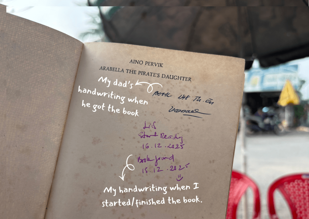The book’s name is Arabella, the Pirate’s Daughter by Aino Pervik, an Estonian writer. What amazed me most is that I’ve always wanted to visit Estonia but haven’t had a chance yet — and how rare is it to find an English book by an Estonian writer in Vietnam?